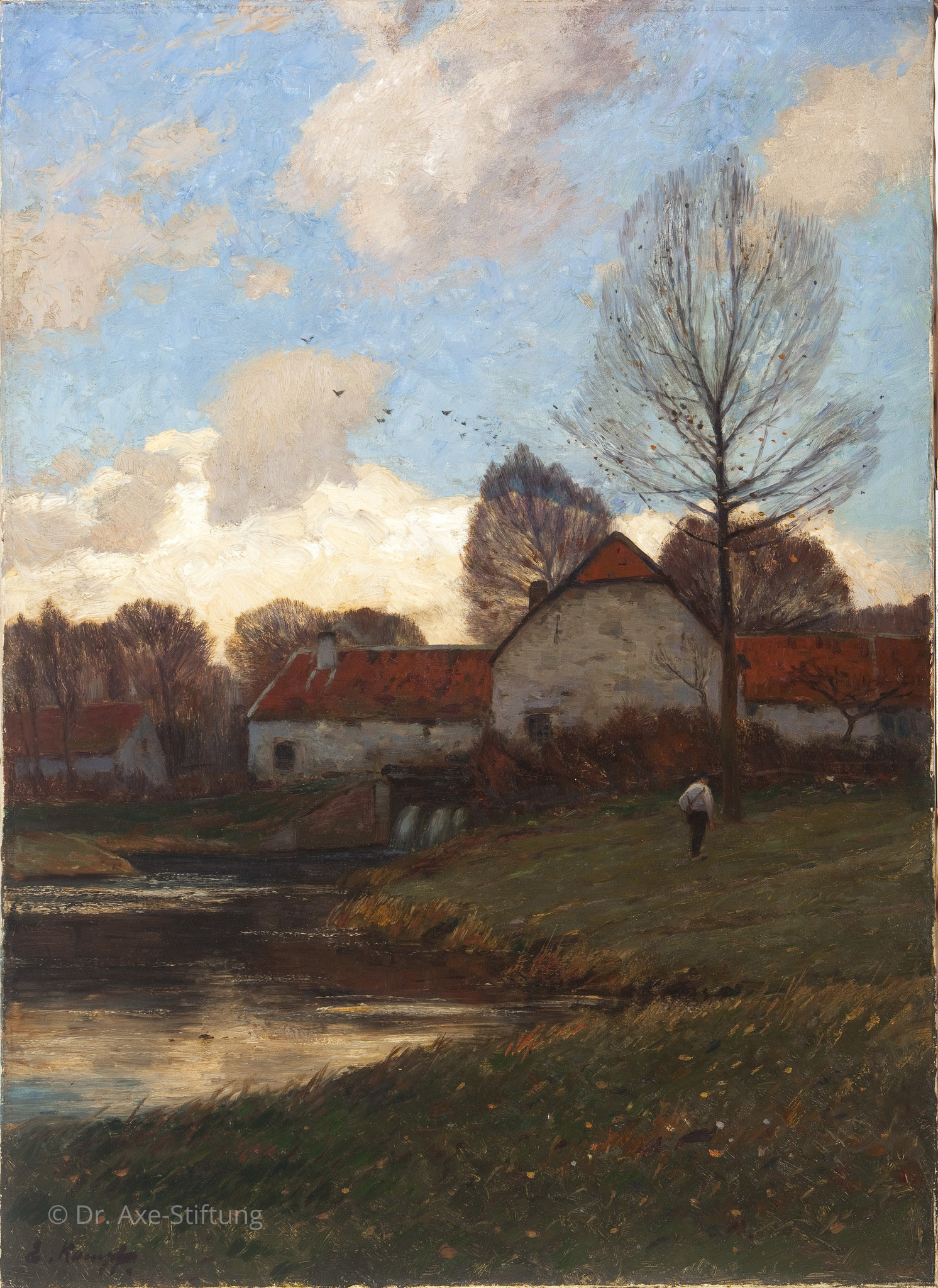 Bauernhäuser wie dieses sind typisch für die Motivwelt von Eugen Kampf. Eine querformatige Variante des herbstlichen Motivs brachte er als Radierung in die 4. Mappe des Künstler-Clubs Sankt Lucas ein, die im Jahr 1900 herausgegeben wurde. Die Dr. Axe-Stiftung besitzt zu dieser Radierung die originale Kupferplatte, die sich in der Ausstellung - gemeinsam mit weiteren Kupferplatten des Künstlers - in einer Vitrine im Erdgeschoss befindet.