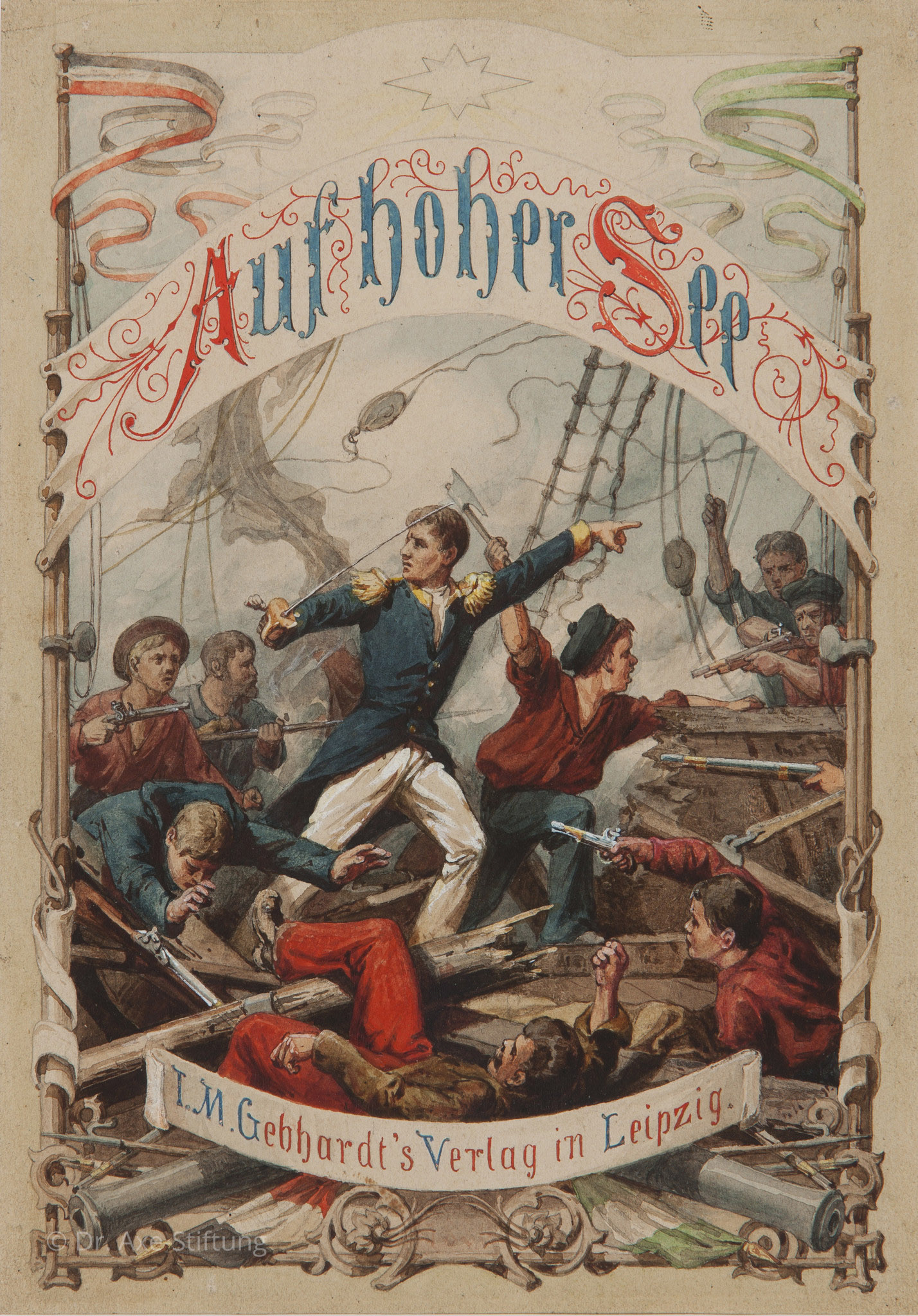 In Gedichtbänden und Romanen konnten nicht nur der Inhalt, sondern auch der Buchdeckel reich illustriert sein. Christian Sell schuf um 1880 in Aquarellfarben die Vorlage für „Auf hoher See oder Die Majestät des Gesetzes. Heitere und ernste Seegeschichten“ des Autors G. Mensch. Das Motiv wurde exakt so für die Publikation übernommen, vier weitere farbige Drucke nach seinen Aquarellen bebildern die Geschichten.