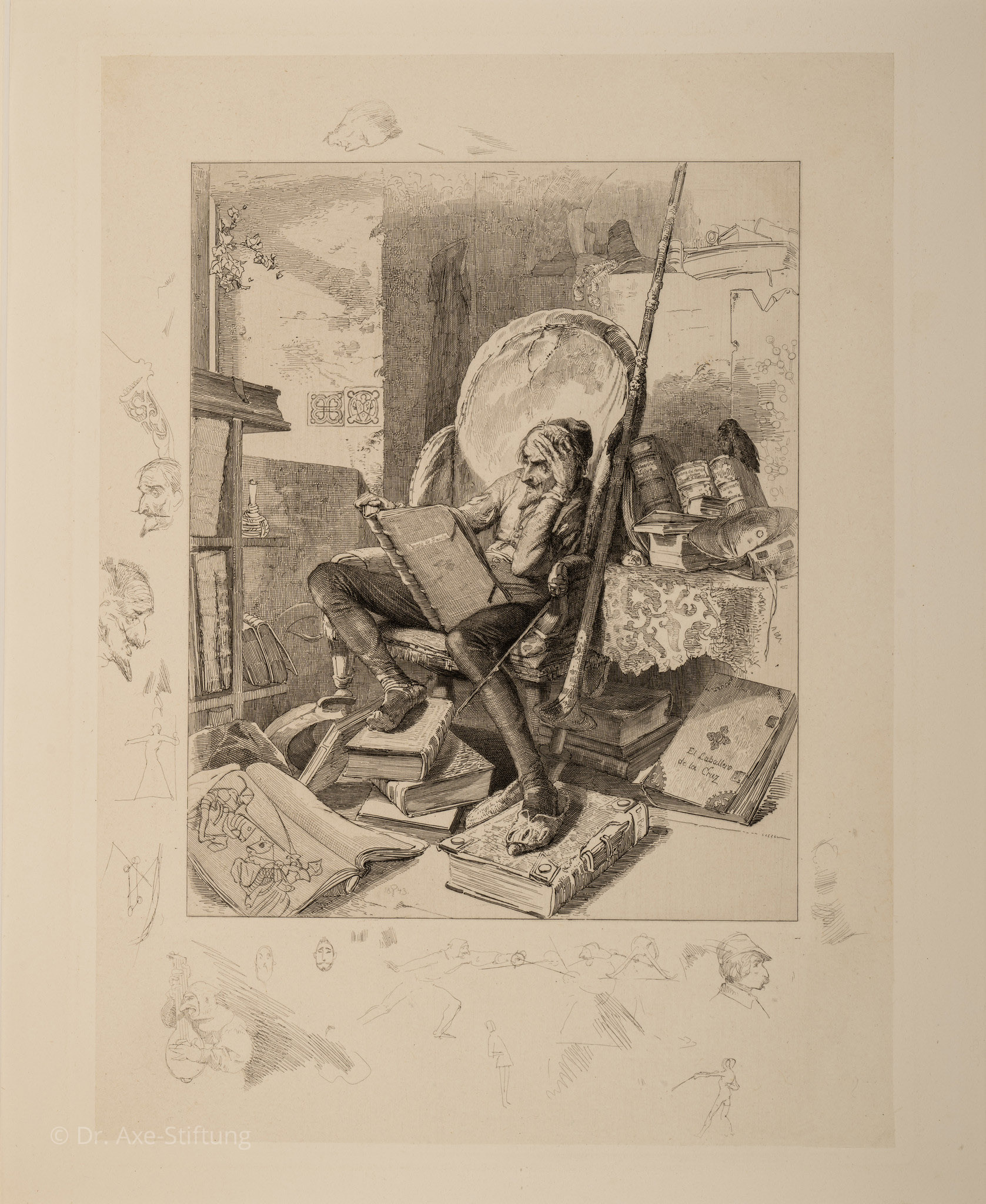 Das Motiv des lesenden Don Quixote hatte Schroedter in dieser Form bereits in den 1830er Jahren in zwei Gemäldefassungen (heute in Köln und Berlin) realisiert. Das Motiv war beim Publikum so populär, dass es mehrfach reproduziert wurde. Neben der Radierung, die Schroedter selbst anfertigte, wurde eine Lithografie, ein Stahl- sowie ein Holzstich gefertigt. Das Blatt zeigt den sich für einen stolzen Ritter haltenden Don Quixote im Lehnstuhl mit einem Ritterroman.