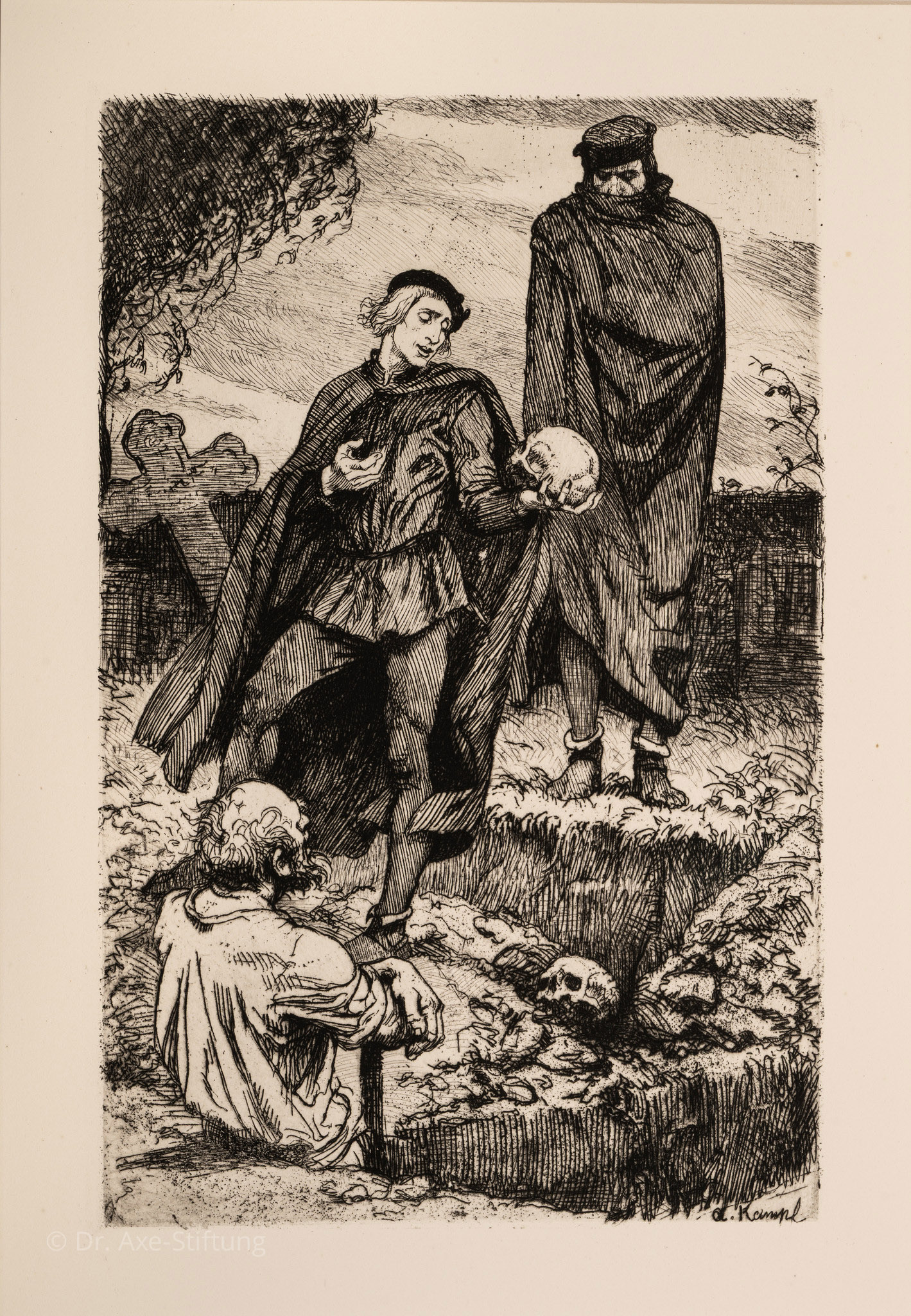 Kampfs künstlerische Virtuosität ist auch in der Radierung einer Szene aus dem Drama Hamlet offenbar. Obwohl man die hier dargestellte Szene direkt mit dem dänischen Prinzen in Verbindung bringen kann, handelt es sich nicht um dessen berühmten Dialog um das Zitat „Sein oder Nichtsein“, sondern um eine Friedhofszene, in der Hamlet den Schädel des ehemaligen Hofnarren Yorick in Händen hält. Die Darstellung war geradezu ikonisch und für „Hamlet“ unerlässlich.