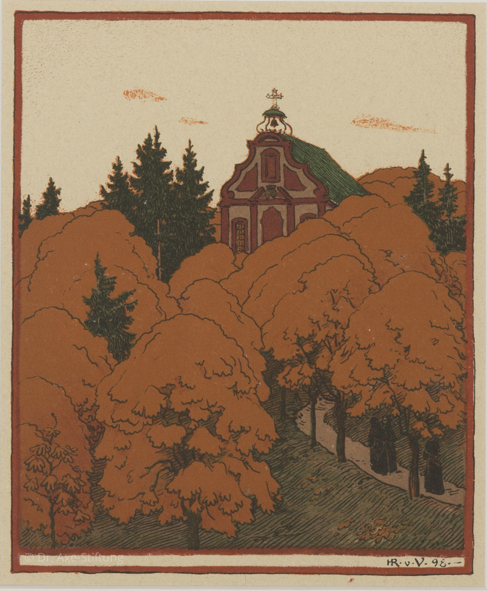 Die Farblithografie der Kapelle im Eifelort Hülchrath entstand sechs Jahre vor Volkmanns Gemälde „Eifellandschaft“. Dabei wird deutlich, dass die Technik der Druckgrafik für den Künstler experimentellere Ausdrucksmöglichkeiten bereithielt als die klassische Malerei: Mit einem ungewöhnlichen Bildausschnitt, der bräunlich-roten Tonalität und den geschwungenen Formen lässt die Grafik an die Form- und Farbsprache des Jugendstils denken.