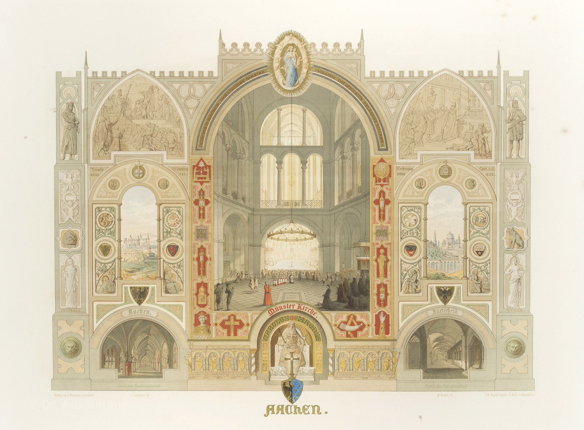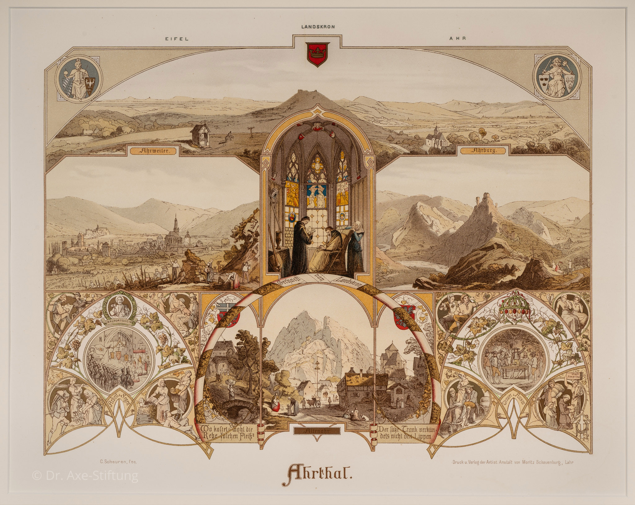 Das Blatt „Aachen“ stammt wie das „Ahrtal“ aus dem großen Album „Der Rhein von den Quellen bis zum Meere“ von 1880. Detailreich und mit großem topografischem Wissen hat Scheuren nicht nur den Dom als Wahrzeichen Aachens, sondern auch die berühmten Karls-Fresken von Alfred Rethel im städtischen Rathaus in die Darstellung mit aufgenommen. Gestochen von Wilhelm Krafft (um 1808 Berlin – 1865 Düsseldorf)