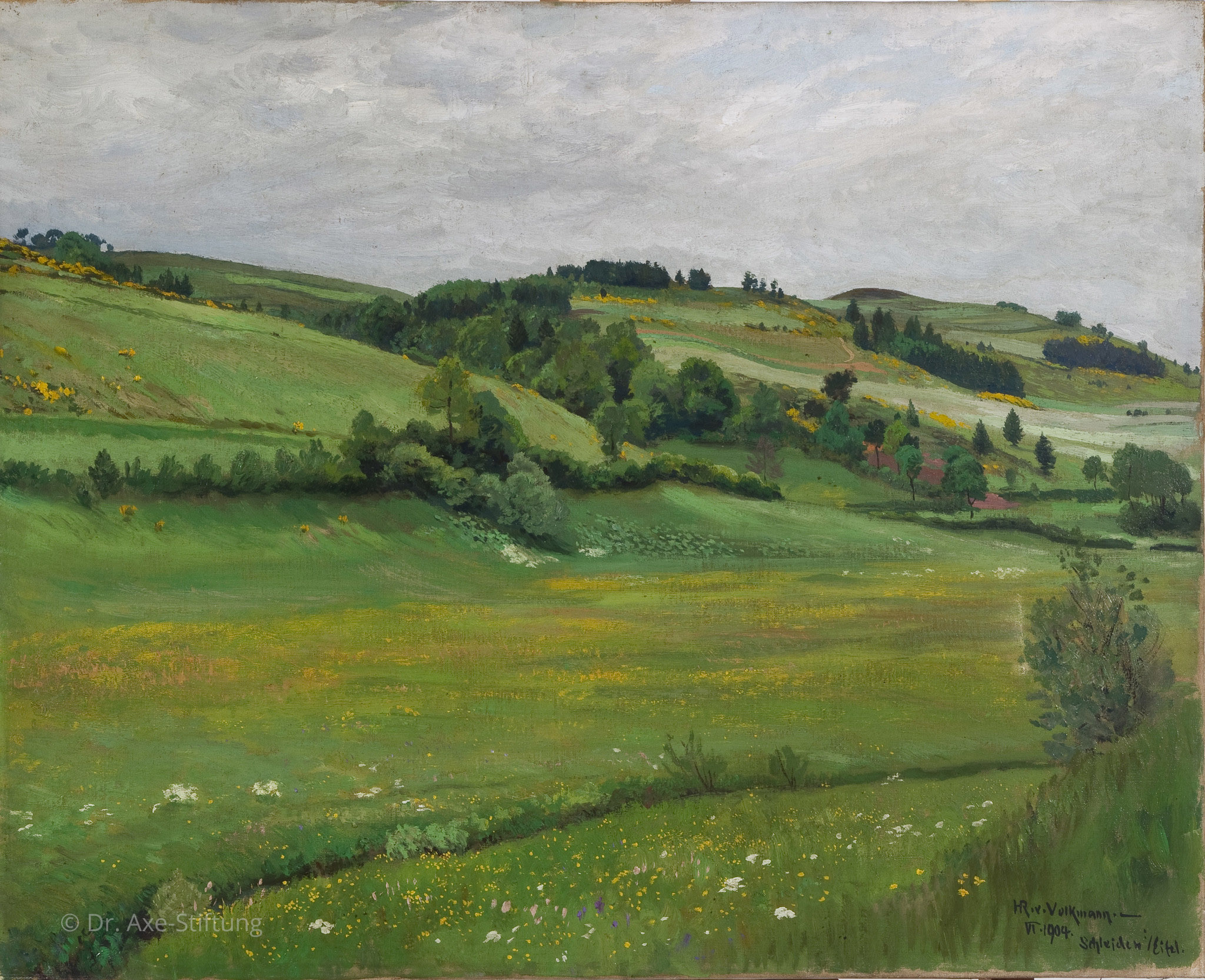 Volkmanns Eifelimpressionen sind noch ganz der realistischen, naturgetreuen Wiedergabe der Dücker-Schule verpflichtet. Sein Motiv für die im Juni 1904 entstandene Eifellandschaft fand er in einem Tal bei Schleiden, etwa 50 km nördlich von Gerolstein. Die überwiegend in Grüntönen gebildete Landschaft mit den farblichen Akzenten durch Ginsterbüsche und Baumgruppen sowie den sanft ansteigenden Hügeln hat Volkmann auch vor der Jahrhundertwende mehrfach variiert.