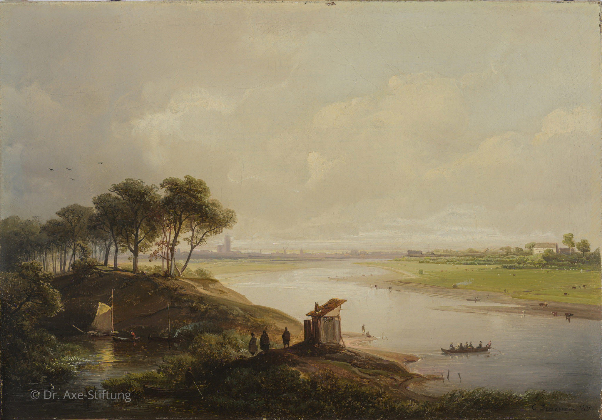 Caspar Scheuren blieb während seiner gesamten Schaffenszeit als druckgrafischer Künstler und Landschaftsmaler tätig. Die Ruhe und Harmonie ausstrahlende Szene der Ruhr bei Duisburg, die er im Alter von 70 Jahren schuf, ist ein charakteristisches Werk von seiner Hand. Das Bild wurde im Mai 2019 als Zustiftung aus Privatbesitz für die Sammlung der Dr. Axe-Stiftung erworben. In der kunsthistorischen Forschung galt es lange als verschollen.